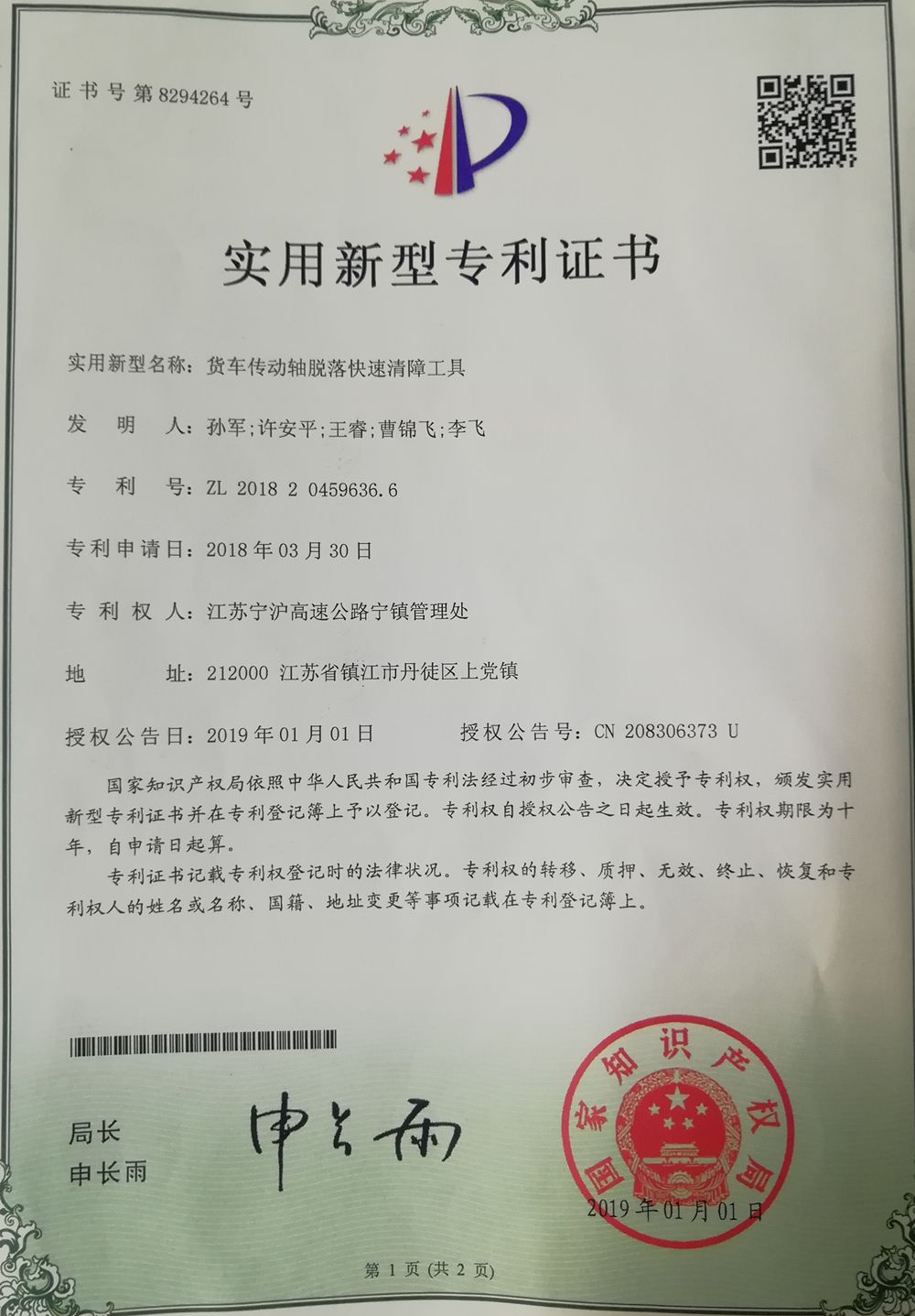 近日,汤山养排中心“橙色工匠”QC小组研发的“货车传动轴脱落快速清障工具”获得国家知识产权局颁发的实用新型专利证书。