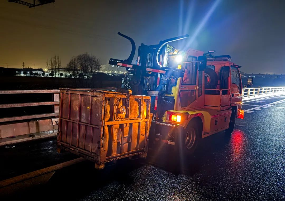 “清障车和洒水车已经到位,消防队也已到达,大家注意安全,先封锁现场!”现场排障三中队中队长李正良果断下达指令。经过现场勘察,确定所运载货物为树脂粘合剂,且路面上胶液已蔓延近百米,堆积厚度达1-2厘米,极易导致路面打滑,严重影响车辆通行安全。清障员迅速在粘合剂洒落区域外布设锥桶,对危险区域进行有效隔离,并摆放警示标志,提醒过往车辆减速慢行,严防二次事故发生。多功能清障车处理散落胶桶,洒水车高压冲刷路面,消防车架设安全屏障,叉车转运胶桶……多方力量拧成一股绳,在深夜中共同筑起一道坚实的安全防线。