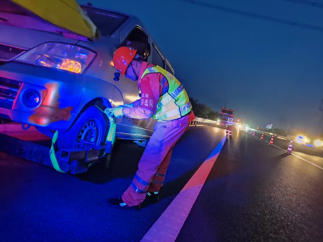 夜深人静时,养排清障员时刻待命,一旦接到故障车辆求助信息,迅速出动。他们驾驶着专业车辆,携带齐全的救援设备,风驰电掣般赶赴现场。凭借精湛的技术,他们争分夺秒地开展救援,让现场车道尽快恢复正常行驶。同时,他们还要做好车流指挥工作,放置警示标志,引导过往车辆避让故障区域,保障道路通行秩序,避免交通拥堵。在闪烁的警示灯和车辆大灯的映照下,养排清障员忙碌的身影成为路上的“守护之光”。