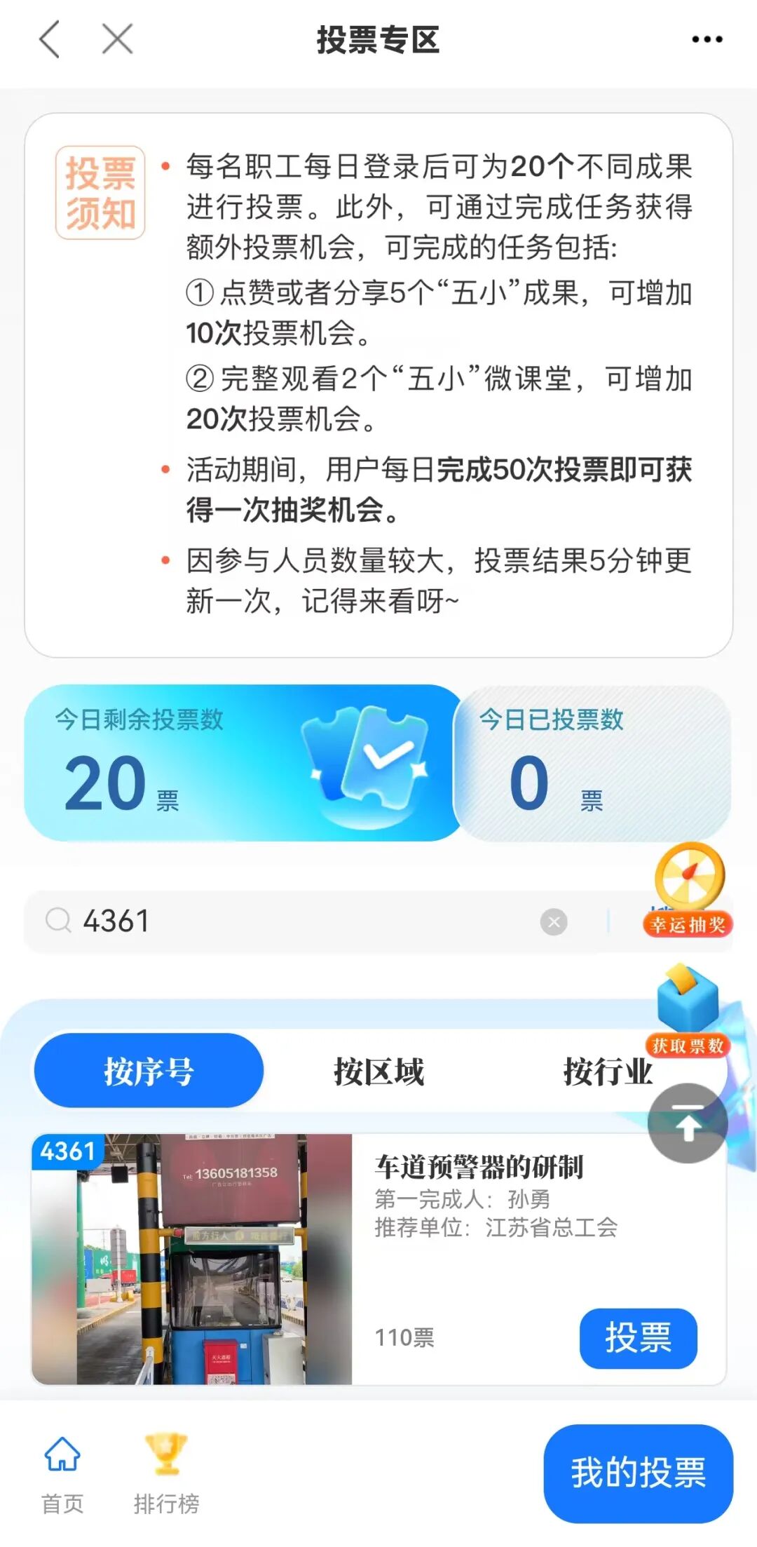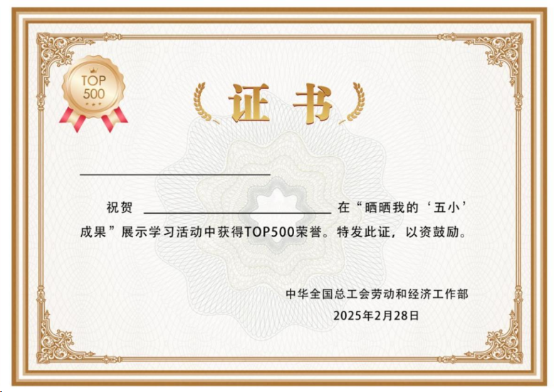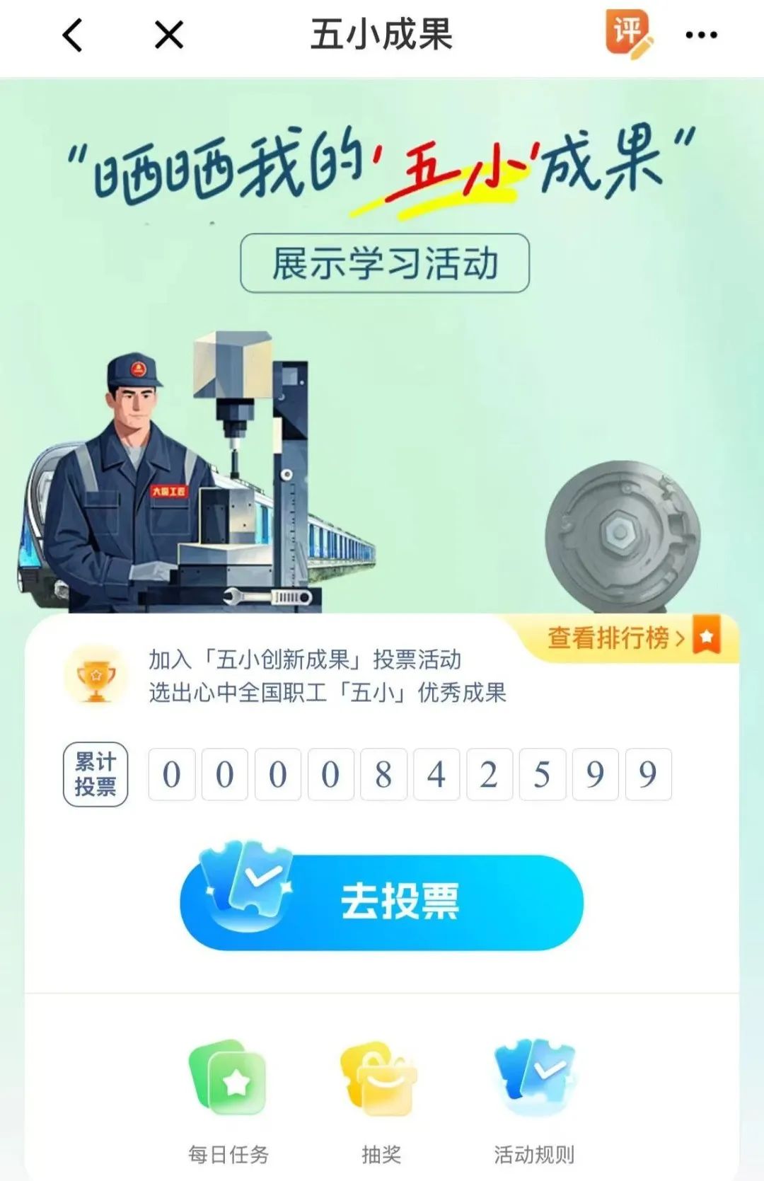 2月25日6点起至2月28日24点,职工可进入“晒晒我的‘五小’成果”展示学习活动专区,观看专区展示的通过形式审查和专业审查的5000个全国职工“五小”成果,并为自己喜欢的成果投票。 投票规则 每名用户每日登录后可为20个不同成果进行投票。此外,可通过完成任务增加额外投票机会。 点赞或分享5次“五小”成果,增加10次投票机会,可为10个不同成果进行投票。 完整观看2个“五小”微课堂,增加20次投票机会,可为20个不同成果进行投票。 关于投票 “晒晒我的‘五小’成果”展示学习线上活动网络投票结果将作为全国职工“五小”优秀成果评选的依据之一,按30%的比重计入总成绩。 TOP500人气成果第一完成人将获得由全国总工会劳动和经济工作部盖章的电子证书一张,并进行身份标识点亮,发放相关物质奖励。 △电子证书示意图,仅供参考 每名用户每日完成50次投票后,可获得一次幸运抽奖机会。奖池内奖品包括100元三网通话费卡、50元京东E卡、5元美团外卖券等。 投票活动结束后 根据网络投票、专家评审 进行综合评价 最终成绩排名前200名的 全国职工“五小”优秀成果 将择机发布 参与方式 第一步:下载“职工之家”APP,完成注册认证。 第二步:点击首页轮播图或者从“职工成果”模块进入活动页面参与投票。 △首页轮播图示意图,仅供参考