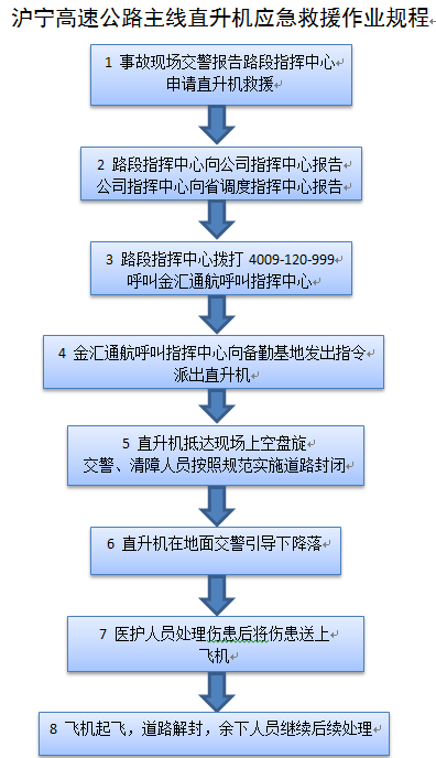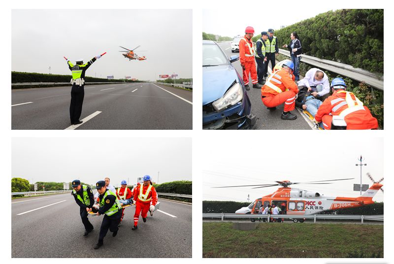 4月24日上午10:45,伴随着引擎的轰鸣声和旋翼的呼啸声,一架直升机空中略作盘旋后,在地面交警的引导下平稳降落在沪宁高速公路上,在现场医护人员的协助下,一位“重伤员”被顺利抬上飞机,随后直升机迅速飞离现场,路段交通很快恢复正常。