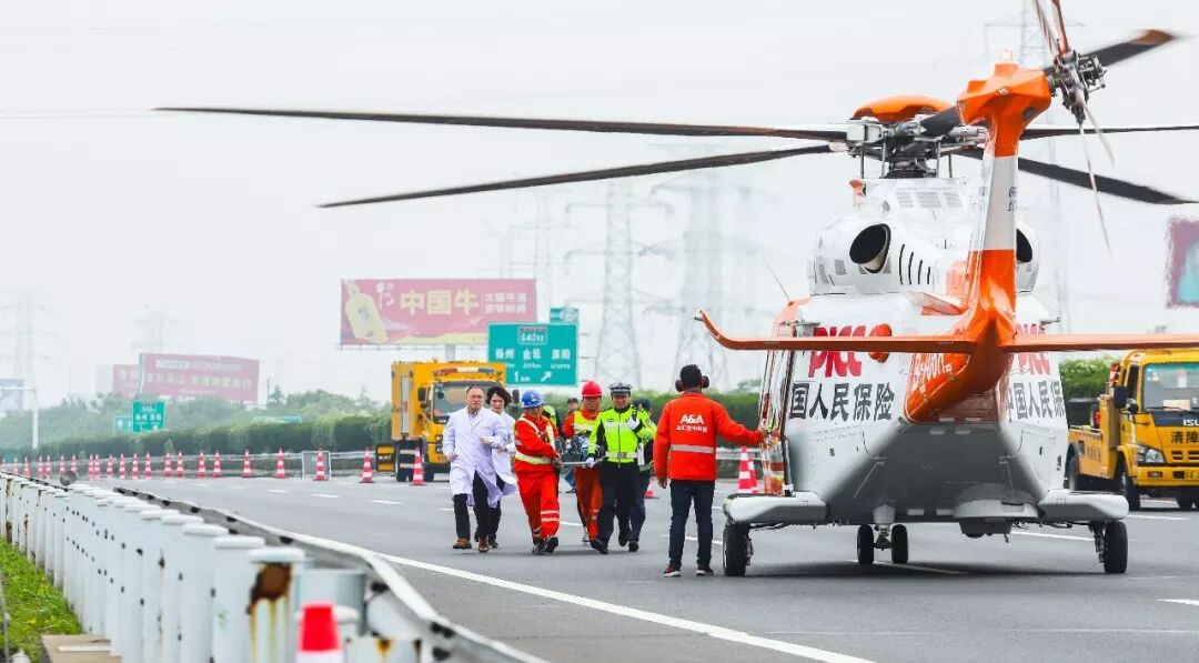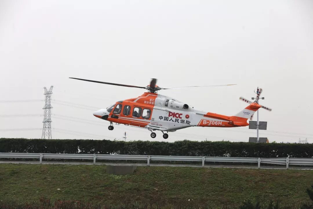 战略合作单位——上海金汇通用航空股份有限公司(简称“金汇通航”)接到救援指令,直升机从备勤基地(镇江大陆机场)起飞至事故点上空盘旋,地面处置人员观测到直升机后将事故路段双向通行道路临时全幅封闭,飞行员观察到地面处置人员指挥手势并进行净空勘察,再将直升机降落在距离事故地点最近的具备起降条件的高速主线道路上。机上医护人员抵达事故地点与地面处置人员进行交接,并对伤者进行简单处理。随后,在地面处置人员的帮助下将伤者抬上直升机。直升机起飞后,道路全幅封闭解除,车辆恢复通行。地面人员继续做好事故车辆清拖及路面清理工作。