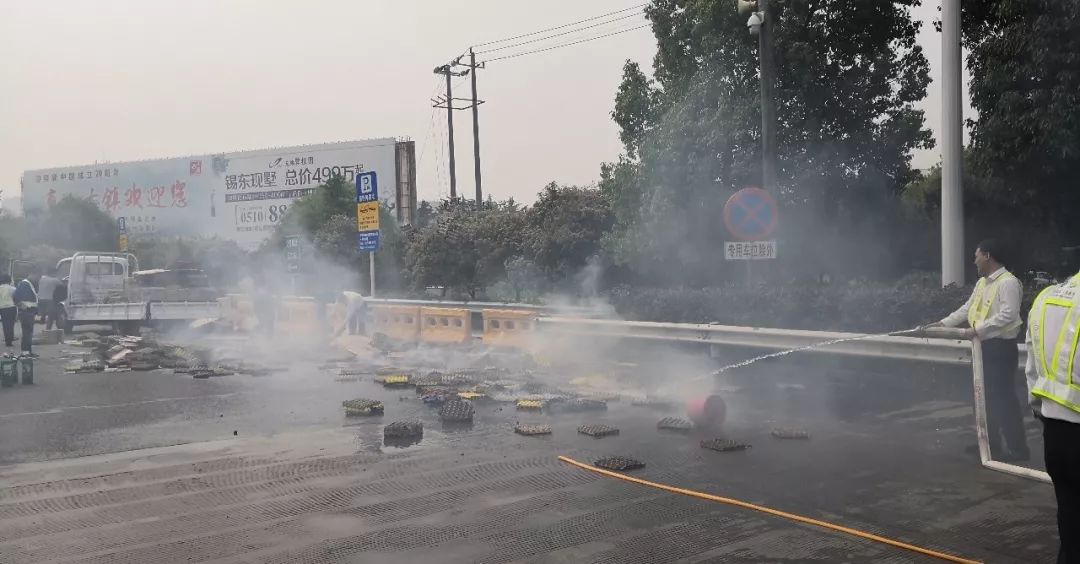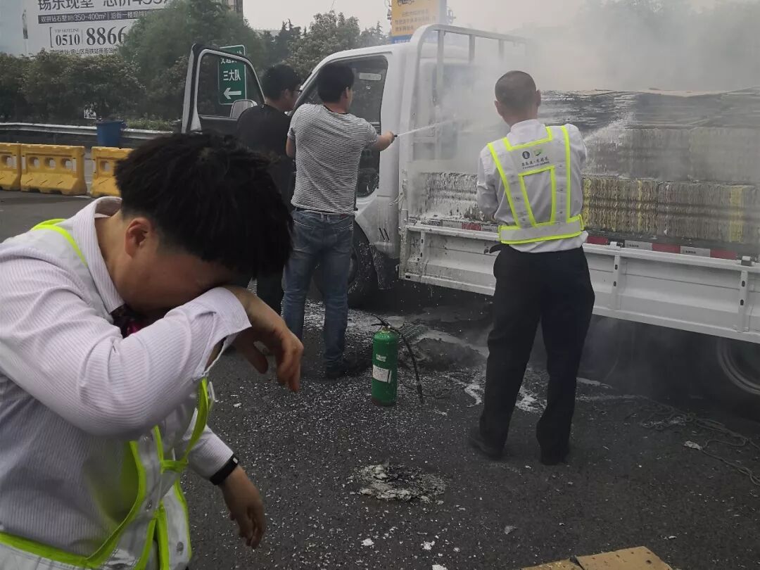 事发当日14:44,一辆车牌为苏MQC092轻型货车驶入锡东站出口9车道,细心的收费员万叶发现车厢部位冒出黑烟并有火苗蹿出,立即上报机房,同时提醒司机车辆着火并指挥车辆快速驶离车道。火情就是命令,正在现场巡查的班委陈彪接报后,立即启动消防应急处置预案,召集机动人员分组施救,一组人员在起火货车周围用圆锥筒设置警戒区并实施救火,另外一组则负责疏导过往车辆安全有序通行。