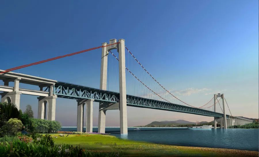 五峰山长江大桥,即在建的五峰山过江通道,是连接连淮扬镇新建铁路和京沪高速公路南延的关键节点工程,大桥全长6409米,主跨1092米,上层为8车道高速公路,设计速度每小时100公里;下层为4线高速铁路,设计速度每小时250公里,是我国第一座公铁两用悬索桥,也是世界上运行速度最快、设计荷载最大的公铁两用悬索桥。大桥预计在2020年建成通车。
