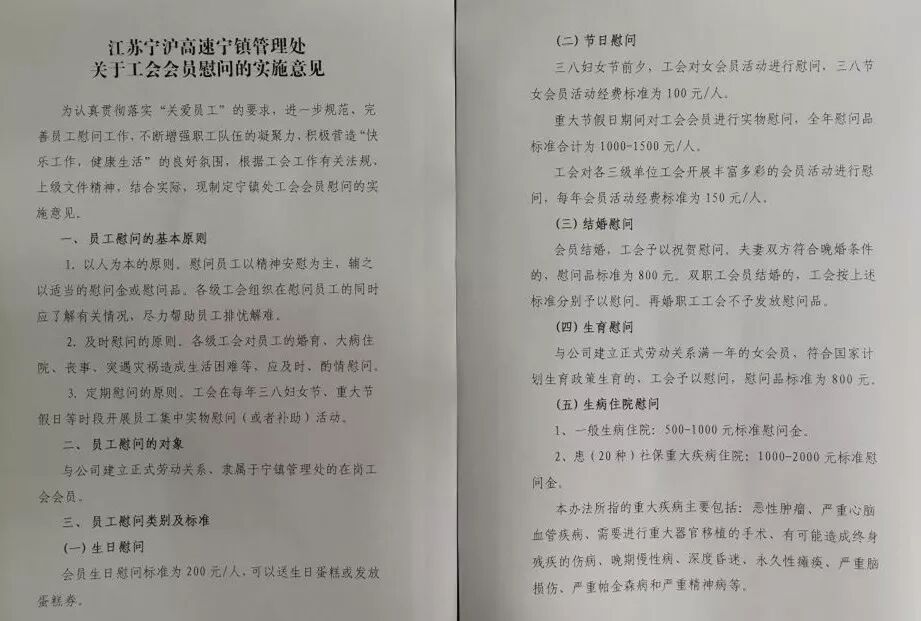 打造“满意型”工会 处工会积极开展“苏高速·茉莉花员工满意食堂”评比活动,做好各分工会食堂“每周菜谱”的交流、借鉴和评比工作,定期开展食堂满意度调查,为员工办“食”事;每月对各分工会食堂进行综合考核评分,并公布得分排行榜,促进食堂管理水平提升,满足员工味蕾。目前,该处镇江站、句容城区站分别获控股系统“五星”和“三星”食堂,南京站正在积极争创控股系统“五星”食堂。 为更好地学习先进单位职工食堂管理经验,处工会于近日组织分工会主席、食堂管理人员赴泰州大桥春江收费站、孟河收费站参观交流,春江收费站“爱心餐厅”、孟河收费站“阳光餐厅”温馨的环境布置、完善的管控流程给大家留下深刻印象,为宁镇处争创控股系统满意食堂提供了借鉴样板。 打造“服务型”工会 宁镇处工会积极探索“互联网+工会”服务模式,将互联网作为工会联系职工、服务职工的重要平台,通过QQ群、微信群,为职工提供全天候服务,打造服务职工 “升级版”;坚持开展职工合理化建议征集活动,组织职能科室整理、分析基层单位职工合理化建议,确保“合理”建议落地生根。 为切实维护职工利益,今年2月份,宁镇处在公司率先修订完善了《宁镇处工会会员慰问实施意见》,制度实施以来,共为7名职工发放慰问救助金和慰问品合计价值 6398元,受到广大职工一致好评。