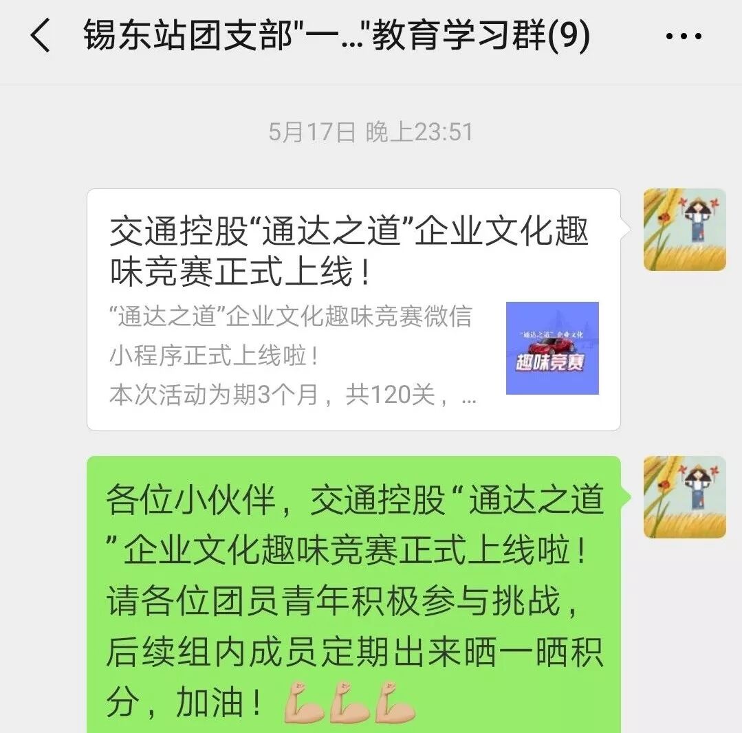 锡东站党、团支部第一时间通过微信群、钉钉群,发布“通达之道”企业文化趣味竞赛上线消息。为便于员工参与活动,将“趣味竞赛”上线时间、学习范围等内容对员工进行详解,并阐明竞赛参与方式及奖励规则,吸引员工主动参与活动。
